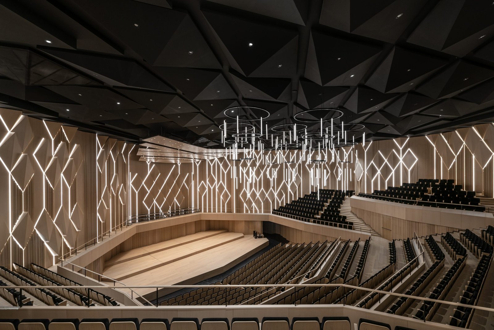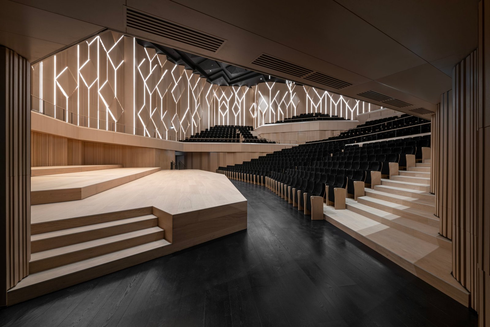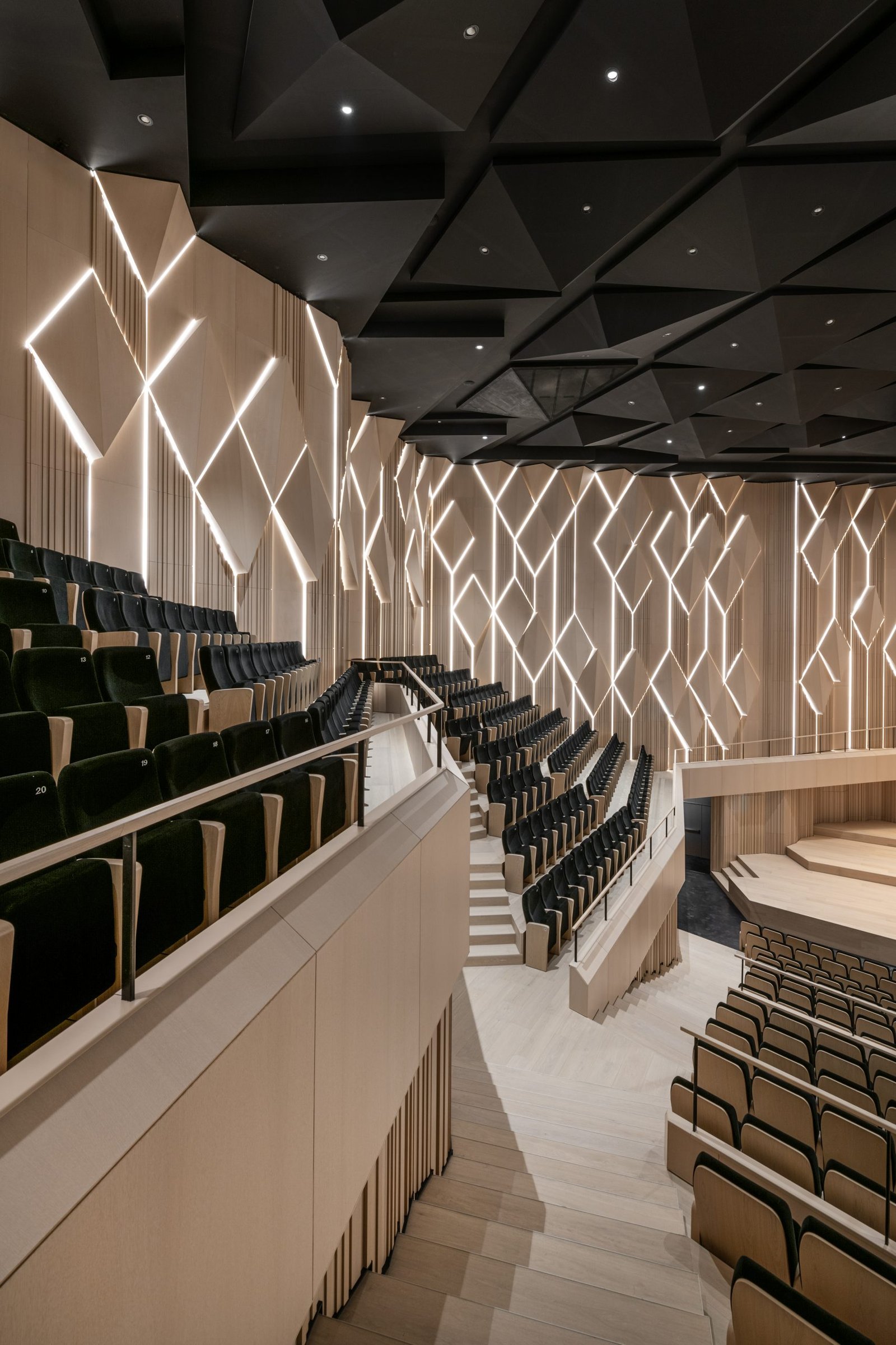 The primary focus of the symphony orchestra hall is the listener. Our main objective was to achieve an entirely new acoustic standard, tailored specifically for symphony orchestra performances of the highest caliber. While the building and its designated space were not novel, they encompassed a volume characterized by intricate geometric shapes. We adopted a "lego constructor" philosophy, wherein, in collaboration with acousticians (the acoustic aspect of the project overseen by the "Akustika plus" team), we meticulously devised several standard elements such as rhombuses, triangles, and both smooth and ribbed planes. Subsequently, we methodically assembled the interior using these components, adjusting their placement—adding or subtracting as necessary—to achieve a harmonious blend of acoustical excellence and aesthetic appeal.
