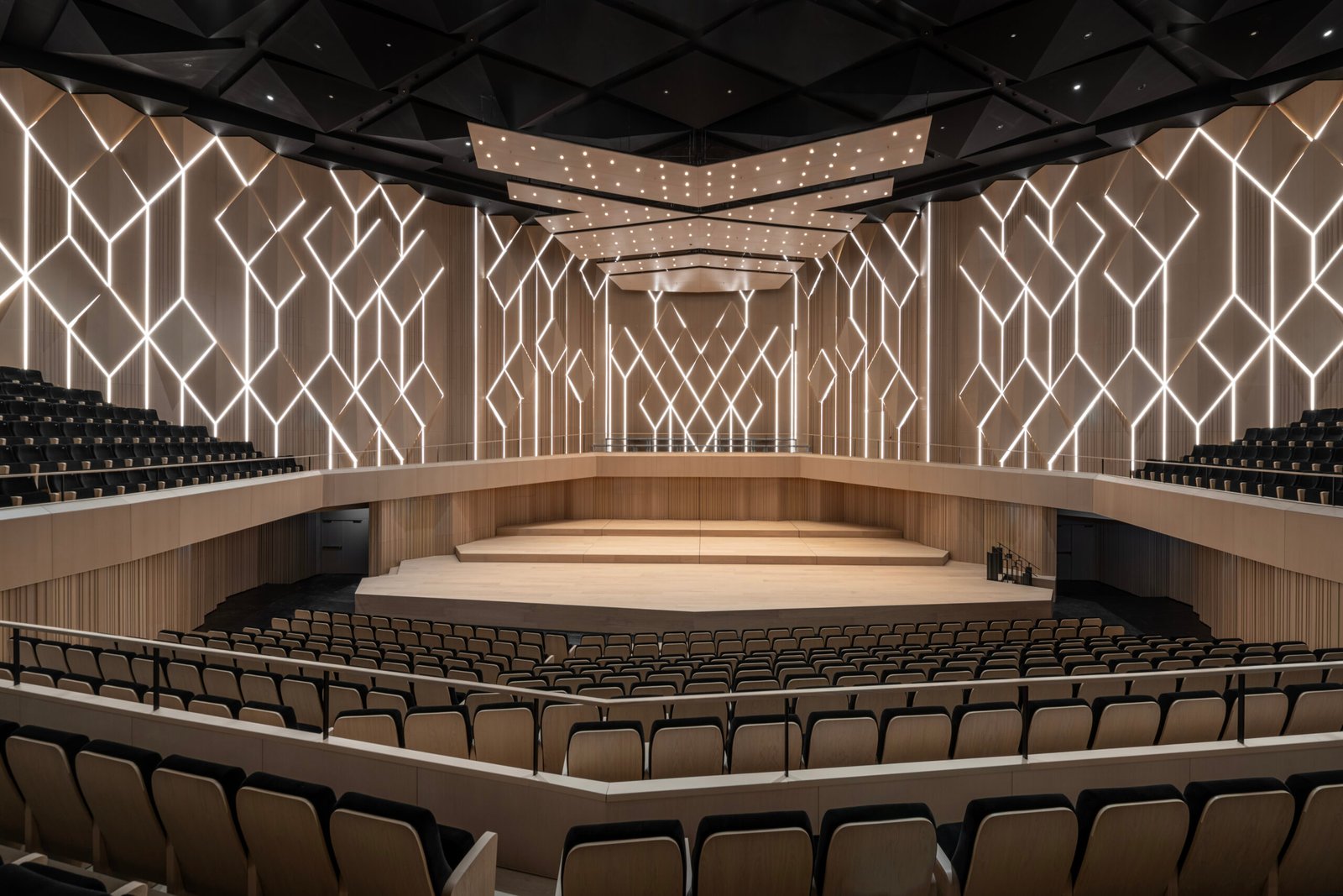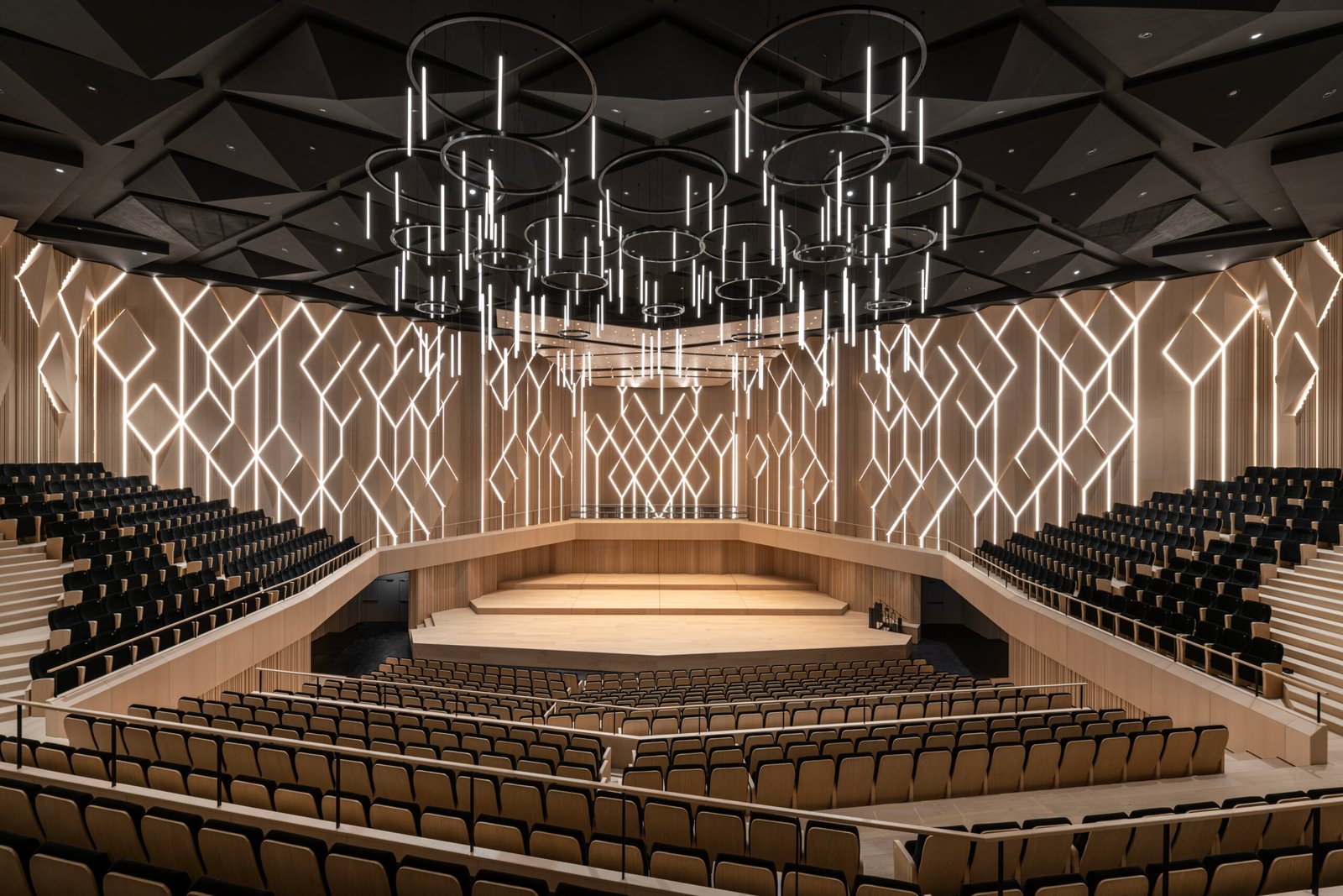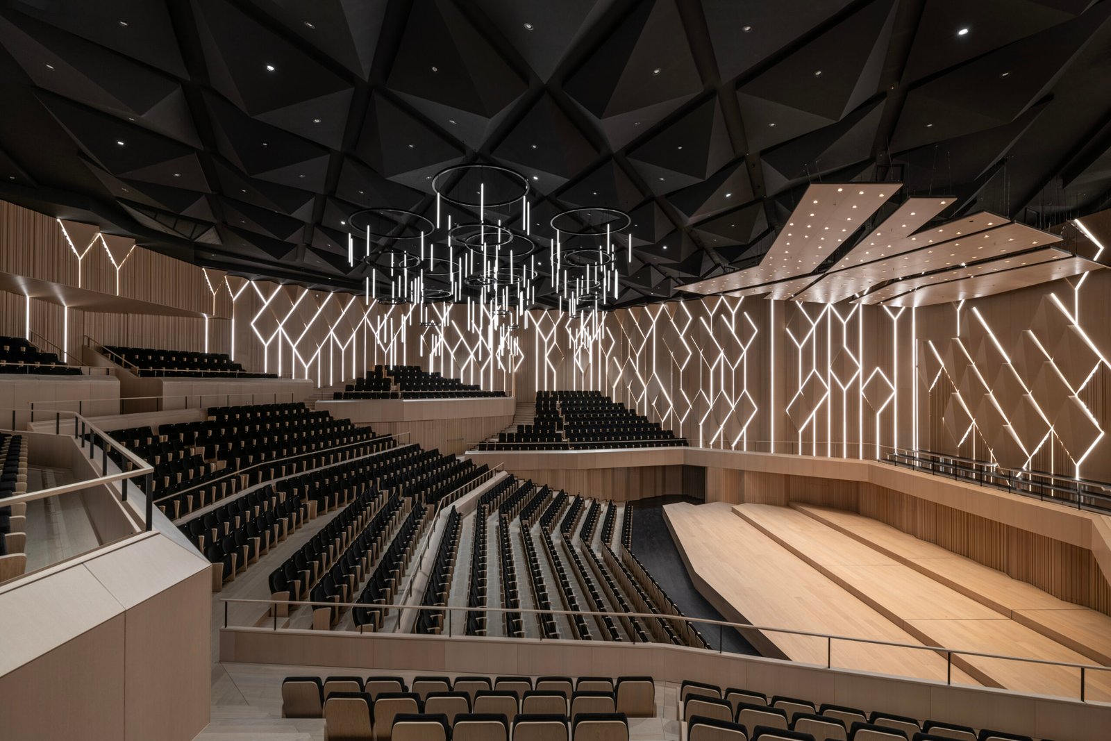 The primary focus of the symphony orchestra hall is the listener. Our main objective was to achieve an entirely new acoustic standard, tailored specifically for symphony orchestra performances of the highest caliber. While the building and its designated space were not novel, they encompassed a volume characterized by intricate geometric shapes. We adopted a "lego constructor" philosophy, wherein, in collaboration with acousticians (the acoustic aspect of the project overseen by the "Akustika plus" team), we meticulously devised several standard elements such as rhombuses, triangles, and both smooth and ribbed planes. Subsequently, we methodically assembled the interior using these components, adjusting their placement—adding or subtracting as necessary—to achieve a harmonious blend of acoustical excellence and aesthetic appeal.
